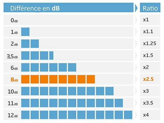 Des études montrent qu'une différence de 6dB dans le niveau de bruit est perçue comme le double (x2) du niveau de bruit.