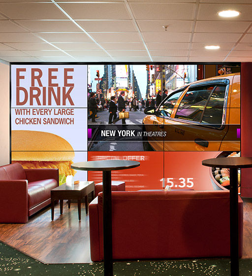 A visit to the concessions stand is de rigueur for the cinema goer, it’s a rite of passage before settling into your seat for the main event. For the cinema owner this represents the ideal opportunity to increase revenues with well conceived signage. Digital menu boards can greatly influence concession sales, promoting time appropriate food choices, combo meal deals and cross sell opportunities within the venue. With instant and scheduled updates the messages and menu options can be changed throughout the day. Here, advertising can appeal to the senses, temping with subliminal messaging in life-size dimension: the fizz of the coke, the popping of the corn – it’s powerful point of sale upselling!