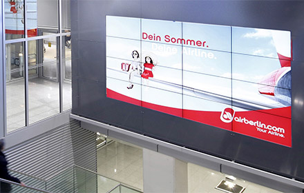 Neben den klassischen und digitalen Werbeflächen in den Passage- und Wartebereichen bestand die Aufgabe darin, oberhalb der Rolltreppe eine große Spanndiafläche zu digitalisieren. Die geringe Betrachtungsdistanz zwischen Rolltreppe und Werbefläche erforderte eine Displaylösung mit hoher Pixeldichte, die zudem den strikten Brandschutzrichtlinien für den Flughafen entspricht. Eine weitere Herausforderung: Tritt der Wartungs- oder Servicefall ein, bleibt nur eine geringe Zeitspanne für Servicemitarbeiter, Probleme zu beheben – im Flugbetrieb lediglich vier bis acht Stunden. Die Wahl der Hardware musste somit auf Produkte fallen, die eine möglichst wartungsfreie Installation gewährleisten.