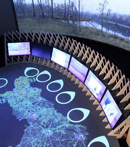 There were many technological requirements but they had to be delivered within a budget. The expenses to build the whole exhibition were limited to 1.2 million Euros, out of which 400,000 Euros was available for AV-technology. Quality was the first issue. Not only the quality of images but also technical quality of the display solutions. All the projectors and monitors are on for most of the time. Also location and position for some of the equipment was unusual. Projectors creating the map are pointing straight down from the ceiling, others are placed at steep angles. Some monitors are located inside walls or behind a glass floor with limited air circulation. Some monitors also point straight up or down. The starting point for the acquisition in 2013 was a bidding among relevant suppliers. Price had a weight of 50 per cent, while suitability, warranty and lifetime together accounted for 25 per cent and lifetime environmental effects made up 25 per cent of the consideration. All the technological peculiarities of the applications were obviously communicated to all the vendors.