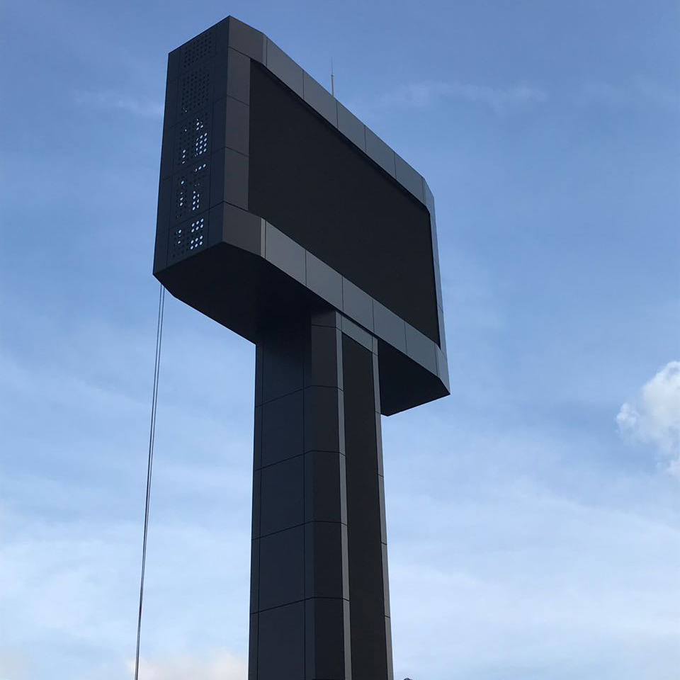 Wir installierten insgesamt vier S[quadrat] SO[10 SMD] NT LED-Videodisplays für die Rennstrecke an einem 15 m hohen, speziell angefertigten Pylonen. Die beiden 21 m² großen Hauptschirme zeigen Live-Übertragungen und Werbung im Verhältnis 16:9. Zwei vertikal ausgerichtete, 6 m hohe LED-Balken am Stand des Pylonen zeigen Renninformationen wie Positionen und die Anzahl der Runden an. Die Wartungsebenen, auf denen der Service von der Rückseite der Displays aus durchgeführt werden kann, befinden sich im Inneren des Pylonen.