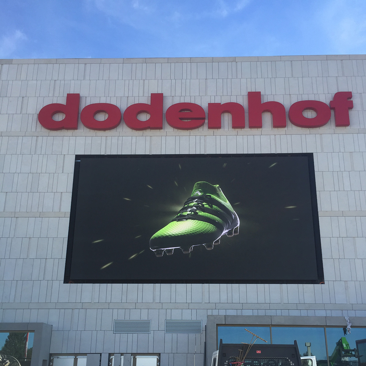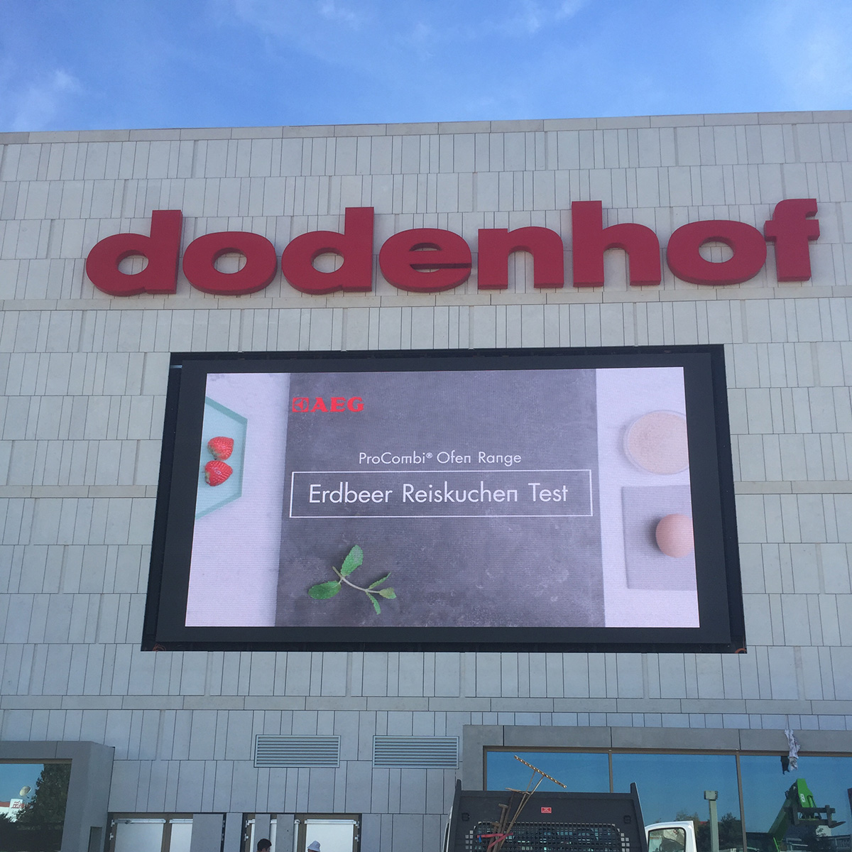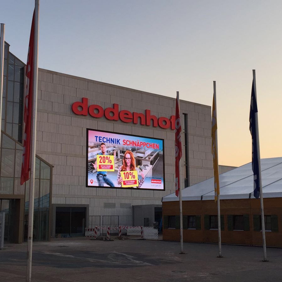 Das Einkaufszentrum dodenhof in Posthausen bei Bremen modernisiert einen Gebäudekomplex und plant die Integration eines LED-Werbedisplays in die Fassade. Künftig sollen Werbevideos und Übertragungen von Live-Events gezeigt werden. Um eine optimale Performance zu gewährleisten, muss die LED-Wand eine ausreichende Auflösung erreichen und auch wechselnden Lichtverhältnissen sowie direkter Sonneneinstrahlung standhalten. Darüber hinaus ist es für die Fassadenintegration wichtig, dass die LED-Wand von vorne gewartet werden kann.