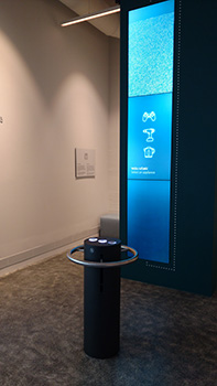 A vertical NEC projector shows lake Þingvallavatn, Iceland´s largest natural lake. By interacting with the exhibit guests can learn about the lake’s rich and diverse biology.