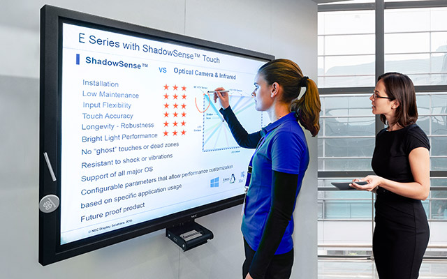 Large format displays in NEC’s E, P and XUHD series offer enhanced ShadowSense™ touch technology for corporate, education and retail environments